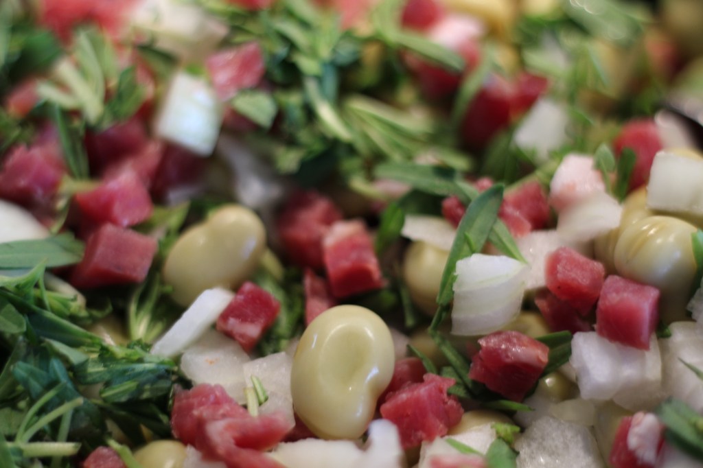 - Nun die Bohnen dazugeben und mit Bohnenkraut, Salz und Pfeffer abschmecken.